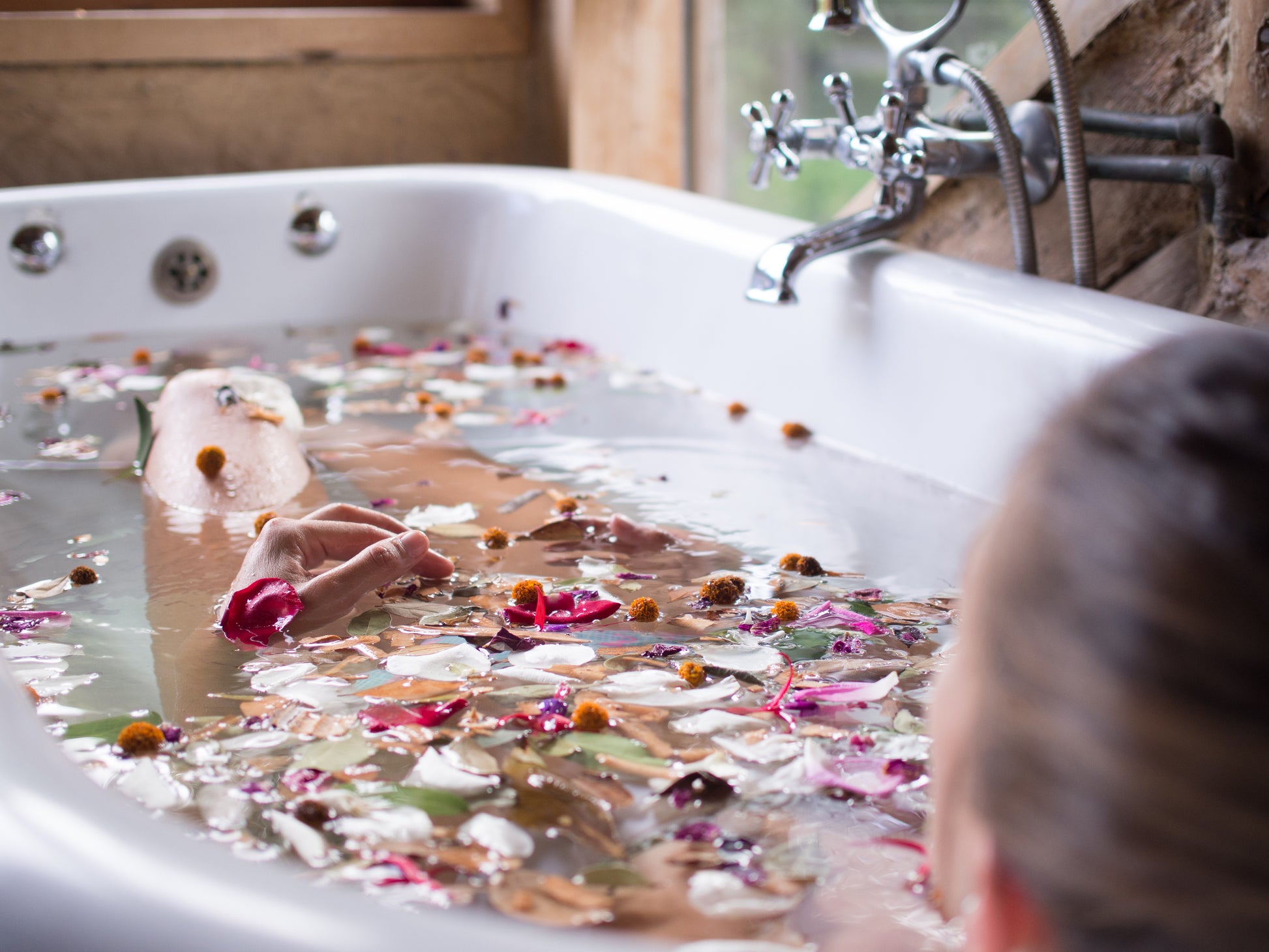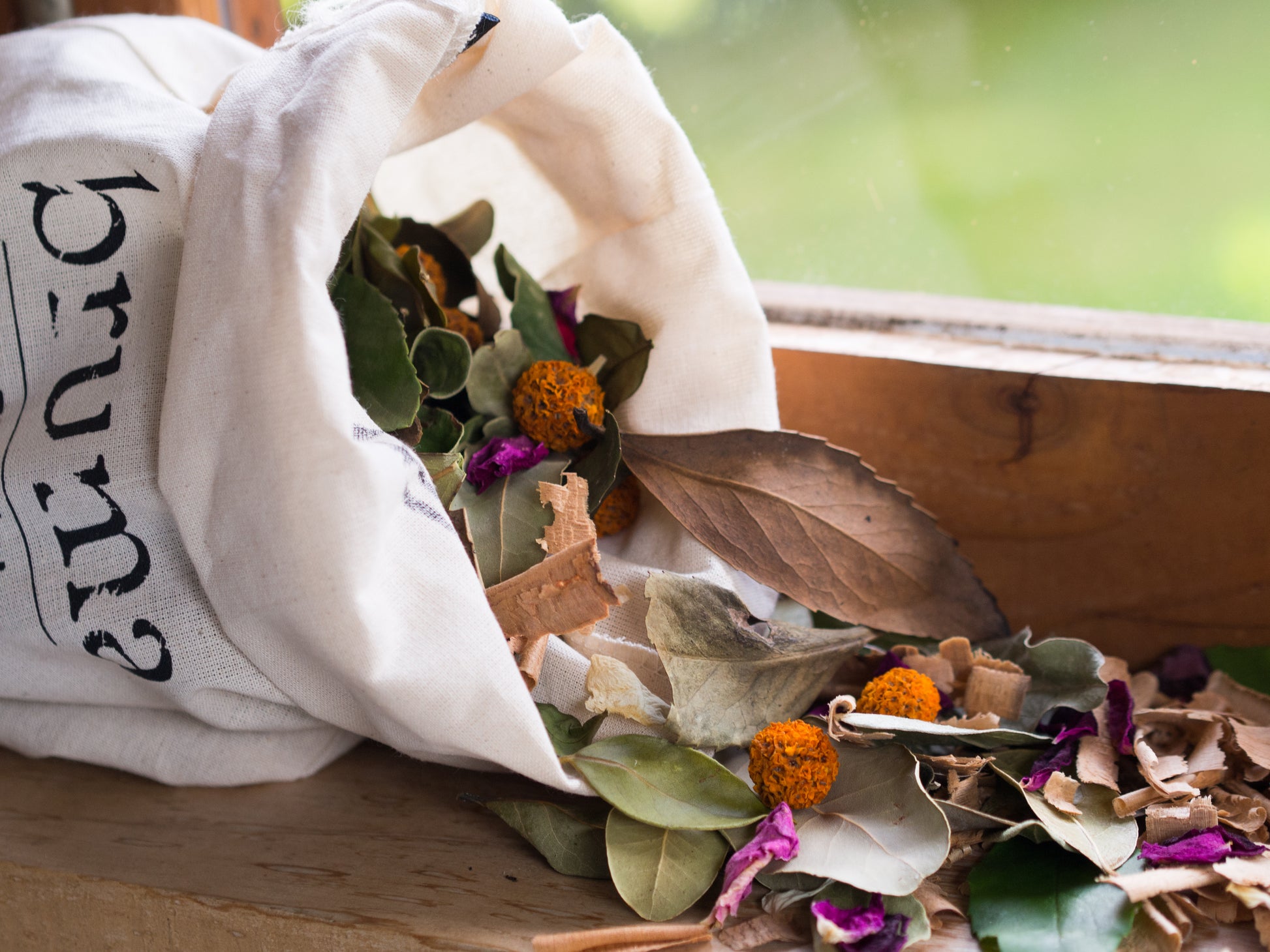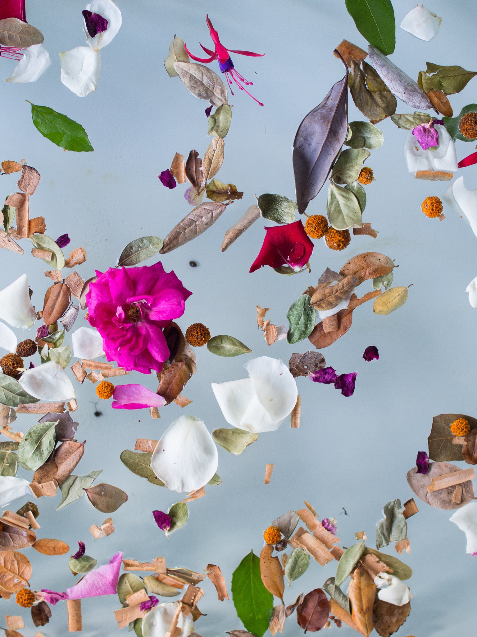 - Sales de baño aromatizadas con hojas de tepa, semillas de pimienta rosada, pétalos de rosas y caléndula.